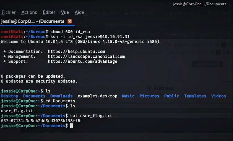 Nous donnons les droits d’exécution à la clé privée et ensuite nous nous connectons au terminal. Après ça nous obtenons le flag du user.