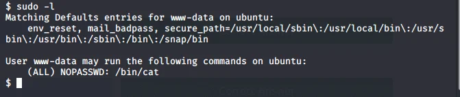 Nous remarquons avec la commande sudo -l que nous pouvons afficher le contenu de root.txt sans avoir les droits du root.