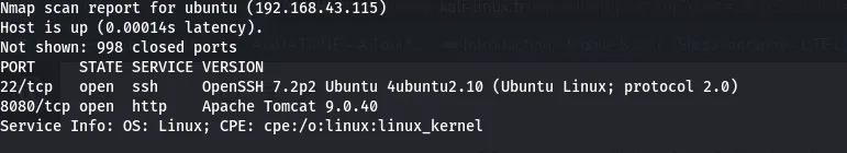 D’après le rapport de nmap, nous pouvons remarquer que notre machine virtuelle a pour adresse ip 192.168.43.115 et a deux ports ouverts.