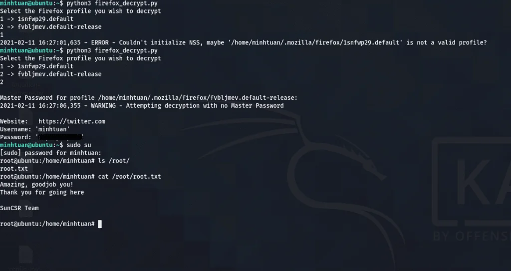 On exécutera firefox decrypt comme nous l’avons fait plus haut avec linpeas sur la machine vulnérable. Le mot de passe trouvé après exécution du firefox nous permet d’avoir le shell en tant que root.