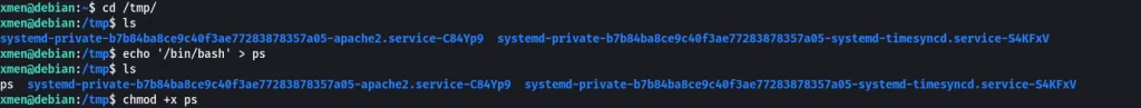 Après analyse du fichier demo.c, on constate qu’un programme système (ps) est exécuté. Nous allons donc créer un fichier similaire au binaire ps dans le répertoire /tmp.